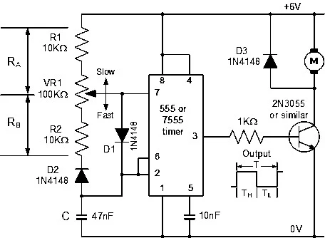 To generate the PWM signal, we can use an Astable 555 Timer Circuit. This circuit, based on the NE555 timer chip, generates the necessary pulses to control the motor’s speed.
